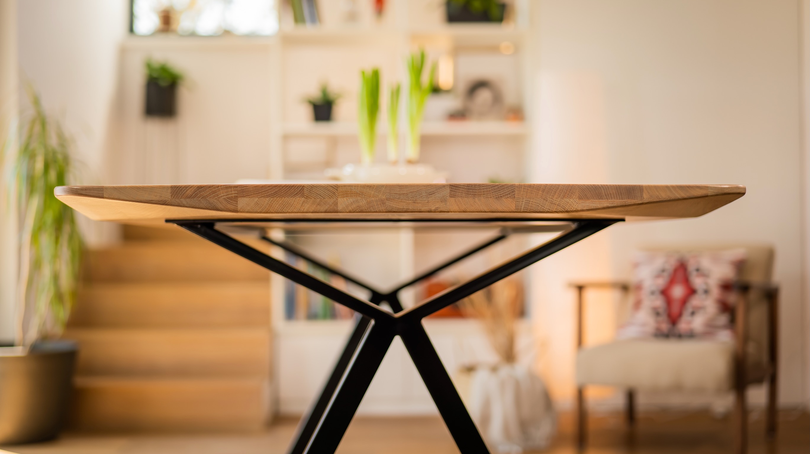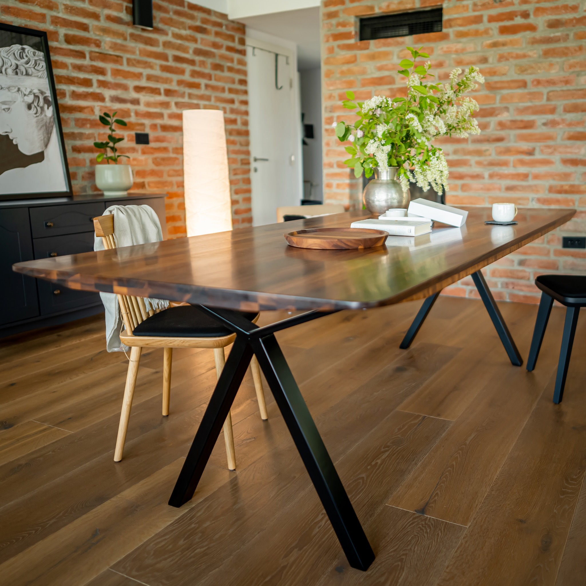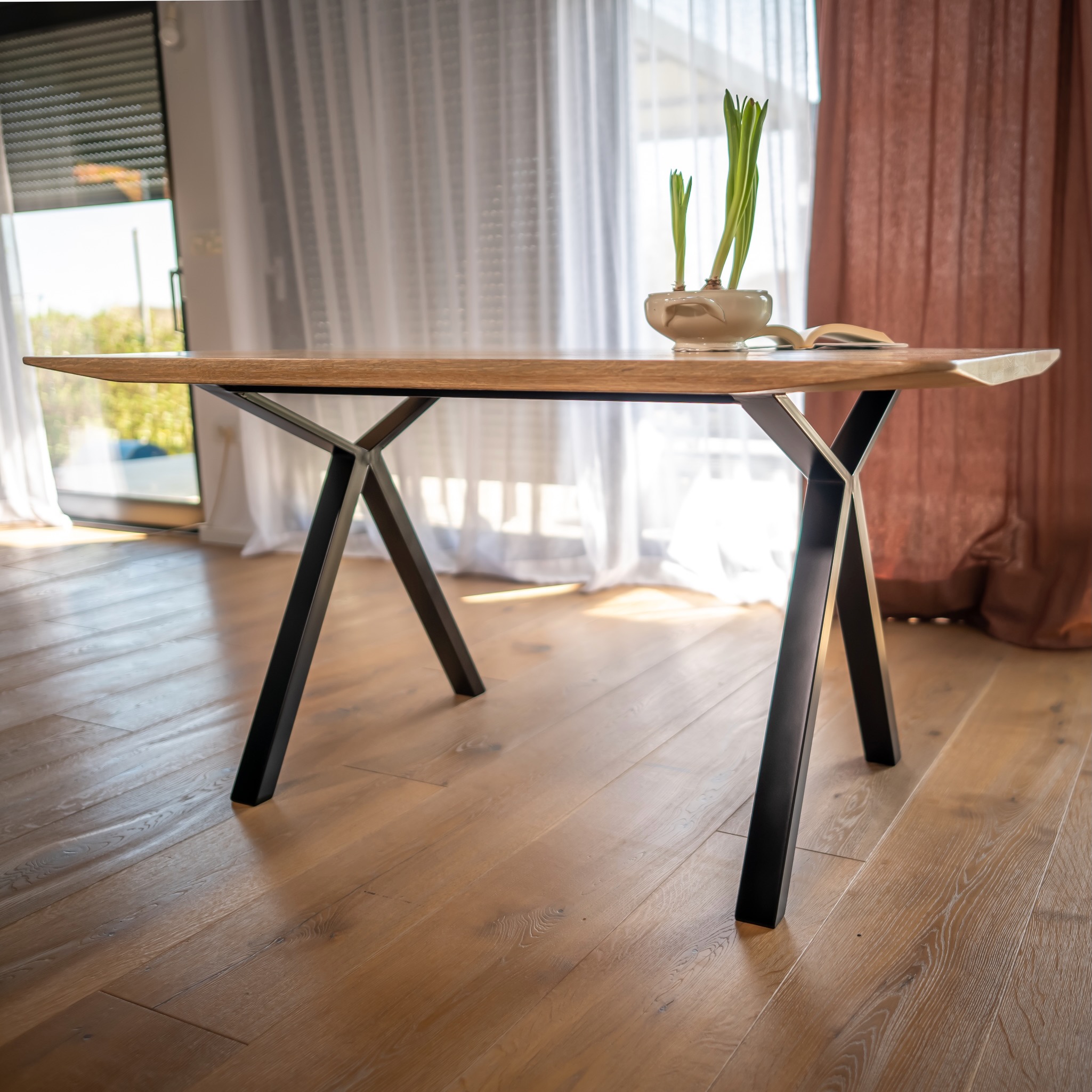 Za svaku masivnu ploču stola od iznimne je važnosti postolje, odnosno noge, koje će ploču stola držati. Željeli smo jednostavan, elegantan izgled stola, a metalno postolje, za koje smo se odlučili, nam to omogućuje. Stabilno, čvrsto i dugotrajno.