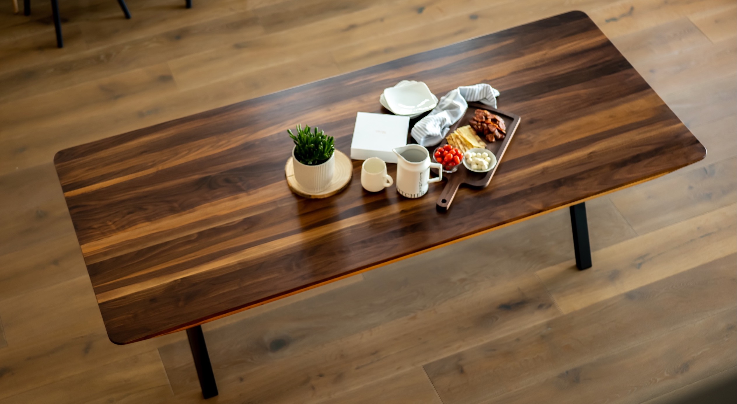Ploča stola izrađena je od masivnih lijepljenih drvenih ploča, strojno obrađena, ručno šmirglana i uljena. Domaći orah, američki orah i hrast vrste su drveta od kojih izrađujemo sve naše stolove.